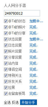人人分手器 “人人网分手器”是武汉大学大三学生谢梦非的作品,是一款Chrome插件(其它第三方Chrome内核浏览器也可用)。只要安装了人人网分手器插件,填入Ta的账号,勾选需要删除的内容,就可以一键删除两人在人人网上的互动,包括@Ta的状态、照片、分享等等,甚至还可以“拉黑”对方。